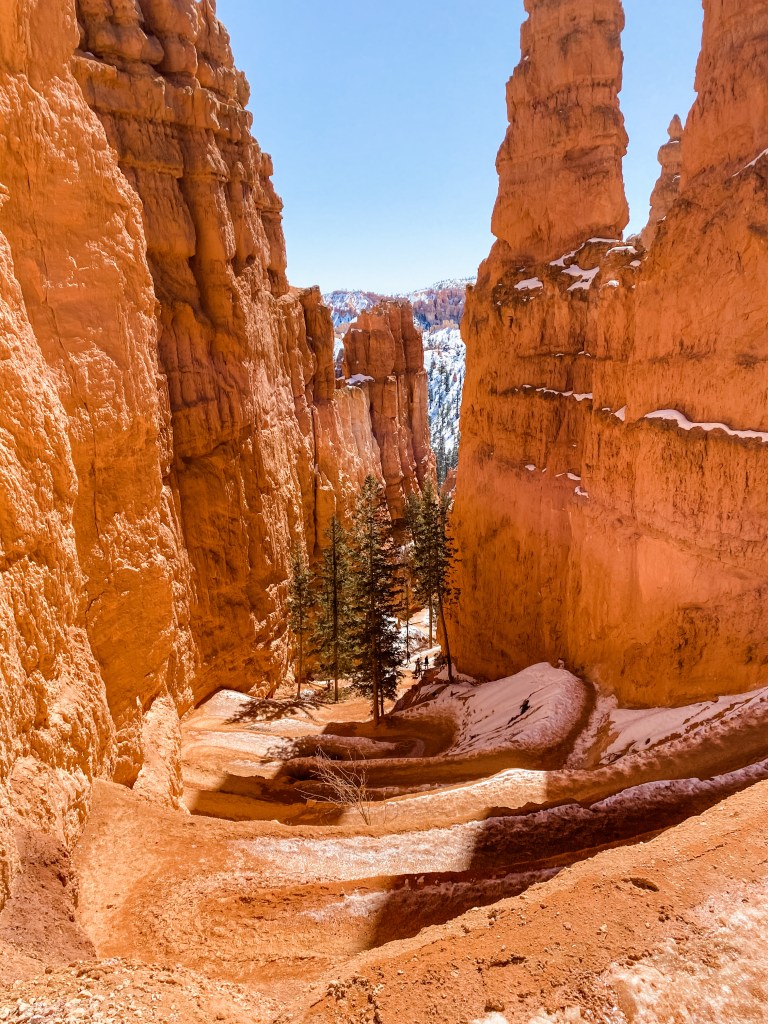This hike dropped us into the canyon right away and gave us a chance to get up close and personal with some of the hoodoos. Once we were at the bottom, I felt like an ant on an ant farm, but in the best possible way. It was a giant natural playground! The trail wound around and through the rock formations and the surprisingly lush forest at the bottom. When it was time to climb again, the trail split into two different routes, Wall Street and Two Bridges. We were under strict instructions to take the Wall Street route, but unfortunately, the decision was made for us since Wall Street was closed for the winter. Two Bridges was the portion of the trail that the ranger had been referring to that was covered in ice and snow overnight, and was actively melting during the day. Until that point, the route was pretty easy and uncrowded. Apparently though, most hikers at Bryce that day did not get the memo to go clockwise around the trail, and they were all coming down the Two Bridges trail, which was slick with orange, cakey mud. I am immensely pleased that we were climbing, not descending for that portion, because the traction was minimal and the potential to look like you just ran a Tough Mudder was maximal.