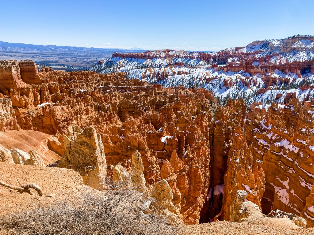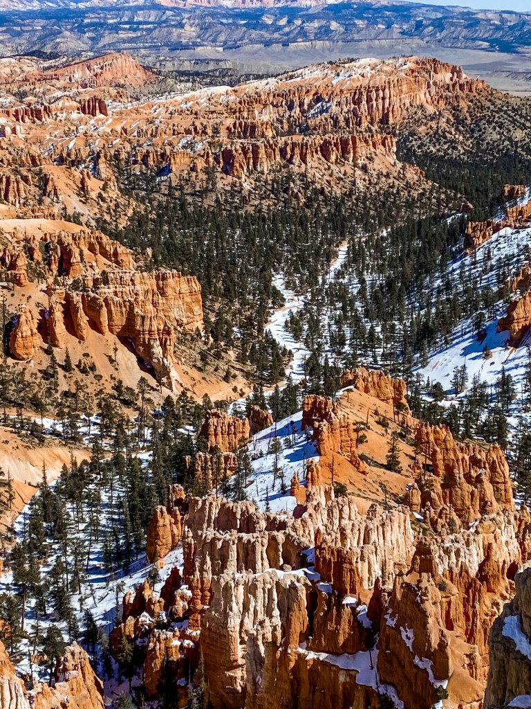 Inspiration Point is the reason you should go to Bryce Canyon. A friend had outlined a route for us that included driving to Inspiration Point, but by the time we finished the Navajo Loop, we were feeling pretty good, and just kept walking along the rim chasing cooler and cooler views. The Rim Trail from Sunset Point to Inspiration Point appeared on the map as 0.7mi, but actually walking it was more like 1.4mi one-way. We’re not quite sure where the disconnect was since there wasn’t much opportunity to get lost just following the rim of the canyon. This trail was definitely less traveled than the other, and the conditions left it snowy and windy, but the constant breathtaking views back into the canyon were more than worth it.